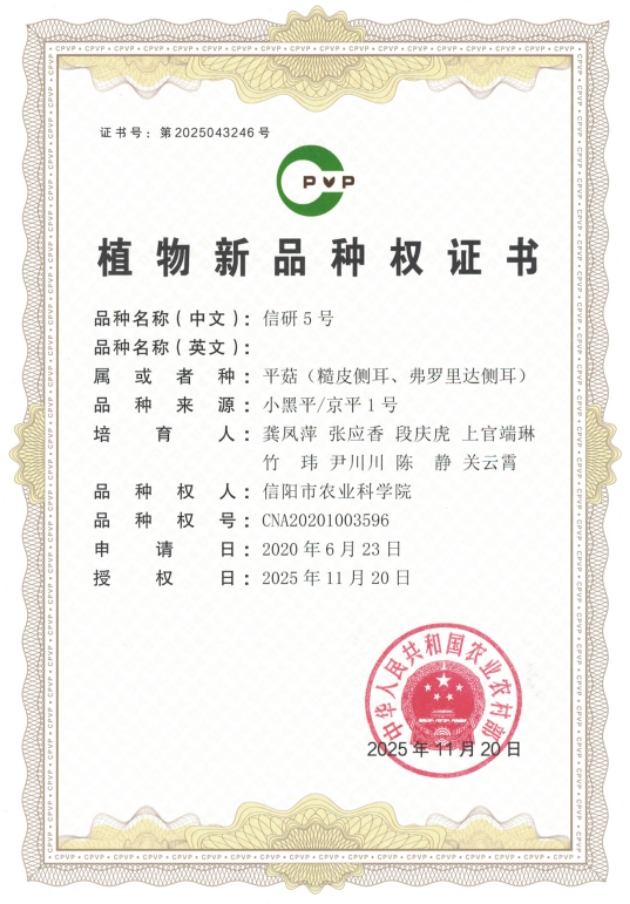 近日,农业农村部植物新品种保护办公室发布授权公告,由我院选育的平菇新品种“信研5号”正式获得植物新品种权。