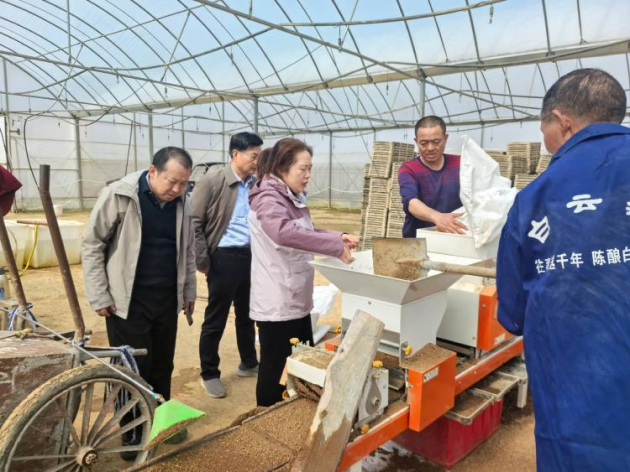 在商城县泰丰粮油种植专业合作社、商城现代农机专业合作社、固始县新绿源种植专业合作社等育秧现场,技术团队实地查看育秧线运行情况,仔细核查每一个育秧环节。对采用精量播种培育壮苗、加装底土压实装置、底土喷施杀菌剂预防苗期立枯病、棚内用鼓风机增温进行叠盘暗化等科学做法,及时给予了充分肯定。同时,结合现场发现的实际问题,专家团队针对性提出改进建议,有的要求增加底土厚度,有的要求增加盖土厚度,有的要求封严大棚,要确保秧苗根系发育良好、出苗整齐、抗逆抗病。