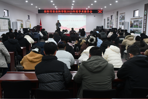12月30日,信阳市农业科学院举办2025年度学术报告会,全体科技人员参会。本次报告会聚焦信阳农业产业发展需求,来自本院各研究所的13位科研骨干,围绕农作物育种、绿色栽培、病虫害防控、产品加工、科技赋能产业等领域带来专题分享。